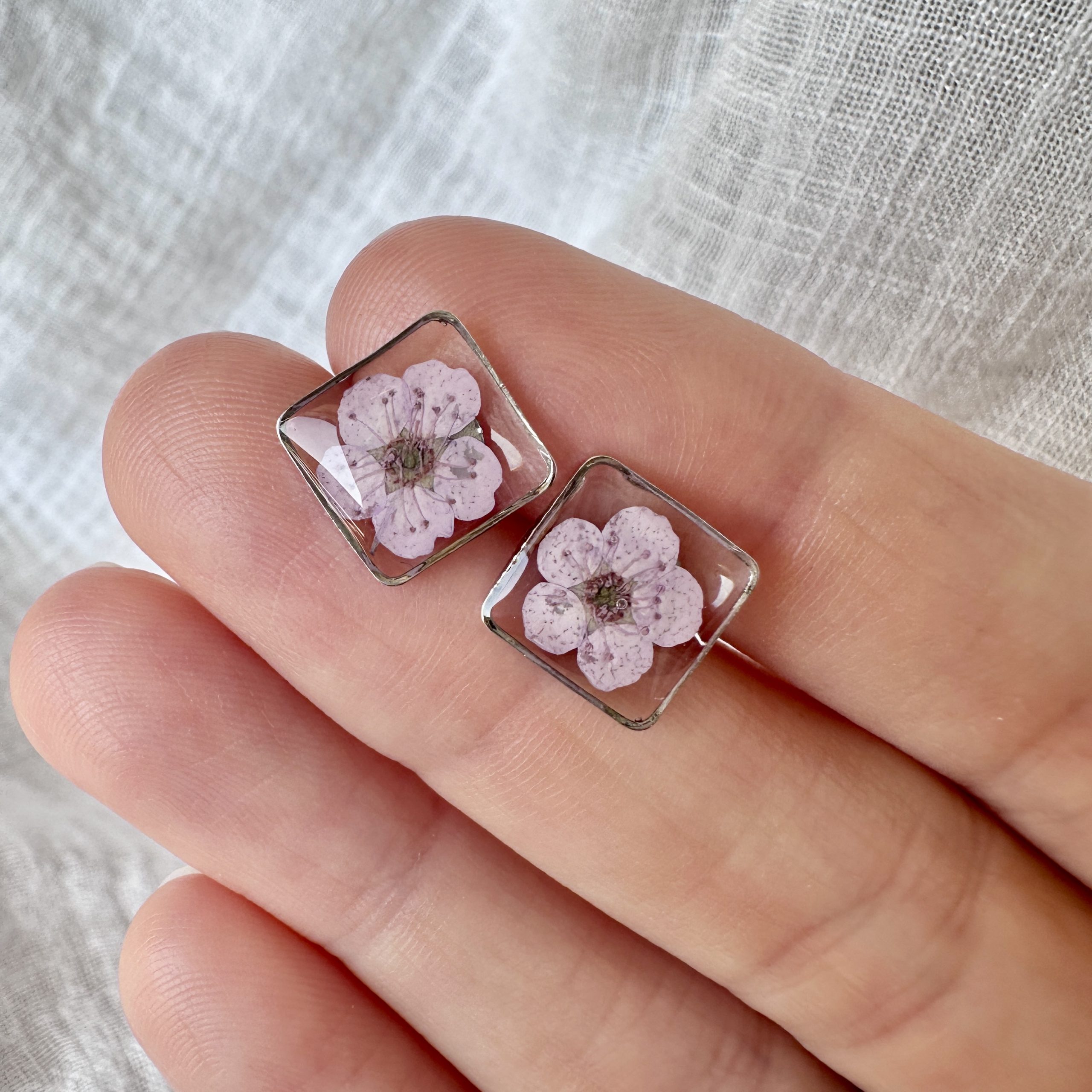 These small stud earrings hold a piece of nature inside them. Each earring is made with real flowers, carefully pressed and sealed in clear UV resin, so their colour and shape stay beautifully preserved.